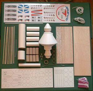 die-cut balsa, 1/8" dowels and foot pads, 18 inch parachute, 24 inch shock