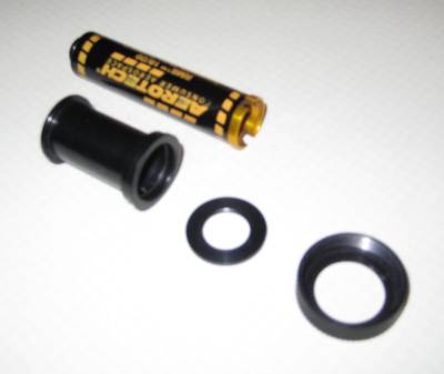 The 24mm motor retainer is a two piece anodized aluminum assembly consisting of a base and a screw on cap. The motor adaptor includes two pieces as well - the adaptor body and a retainer ring.