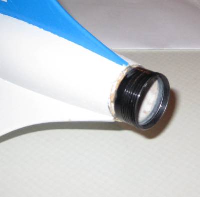 The Arapahoe-E was a bit trickier installation since the rocket has a full balsa tailcone. After eyeballing the tailcone for a bit, I used a sharp hobby knife to remove the lower 1/2" of the tailcone. The hard part was removing only the balsa without damaging the motor tube. Once the motor tube was exposed, I sanded the end until I was able to fit the motor retainer. As with the Stonebreaker, I used JB Weld to attach the retainer base. The inside joint required only light sanding for the motor and adaptor to fit.