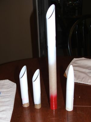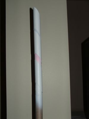 Bill used a copy of the original instructions with this kit. They weren't overly descriptive, but anyone with a few birds under their belt will have no trouble with the construction. The two halves of the main body tube are attached with the coupler and wood glue. I then tied the length of Kevlar around the engine block and secured it with wood glue, then glued the engine block into the lower section of the main body tube. The giant screw eye was epoxied into the nose cone and attached with a large snap swivel. At this point the rocket was complete except for attaching the tube fins, which was done with epoxy after all painting was finished for reasons of masking impossibility. The method for attaching the tube fins is fairly simple. An extra piece of body tube the same diameter as the tube fins is provided and the first fin is carefully epoxied into place so that the foremost tip of the fin is flat against the main body tube. Once this tube dries the extra piece of tubing is secured in place with masking tape and the next tube fin is attached so that all three pieces of tube are flush with each other. The second tube fin is then epoxied into place and the process is then repeated for the final tube fin.