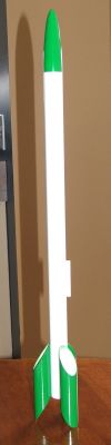 The normal process of thinned Elmer's Fill 'n' Finish and sanding was used to kill off the grain in the balsa nose cone, the spirals in the tubes and the seam in between the two body tube halves. As usual, I went with the package art when painting, which is in this case green. I'm not normally a fan of green and more than likely would have opted for white with red or blue accents, but the decals came in green so I went with the flow. I couldn't figure a way to paint the tube fins after they'd been attached to the main body tube, so I painted all of the components before final assembly. For the nose cone and tube fins I used a Valspar green that matched up well with the green on the decal and Valspar gloss white for the main body tube. Decals were coated with Testor's Decal Bonder before they were applied and they were great to work with. The final product looks like something that I'll want to coat with a clear to protect it. It really turned out great.