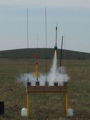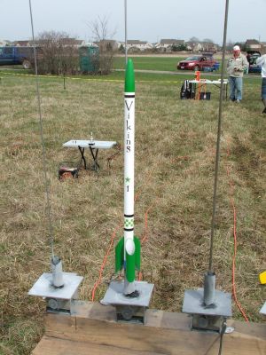 First and only flight to date was at my first QUARK launch of 2008 (and first in almost six months). I'd bought some C11-7 and D12-7 motors for the launch anticipating several flights, but I'd underestimated the winds for the day. The Viking on a C11-7 was the third flight of the day and everything about the flight impressed. It left the pad and never seemed to waver on its arrow straight ascent. It was at ejection that the fun started. I had a small 10" chute on it and at first it looked like it might be an easy recovery walk, but then it started hanging. I watched as it crossed the park heading for the Kite Fest. From the flight line, touchdown looked like it was right in the middle of the kite flyers. I took off after it, careful to keep in line with the landmark that I'd picked out during the descent. As I neared the soccer field where many of the big kites were flying, I noticed a small, clear parachute blowing around on the ground. It seemed closer than I was expecting, but there was a lady there waving at me and standing guard over the Viking. She had as many questions about rocketry as I had about the kites. (Her husband was flying a $1200 USED kite just behind us, and it was true that some of the big ones could indeed cost up to $18,000.) Impressive flight, but I knew I'd never have the guts to try it on a D12-7 that day.