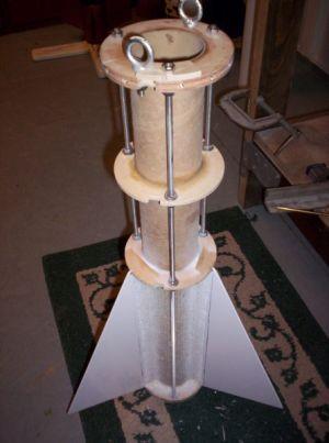 The design of the fin mounting was completed with help from Art Upton at BoosterVision. This is a fin can unit with three 1/4" all-thread rods that tie the centering rings together as one strong unit.