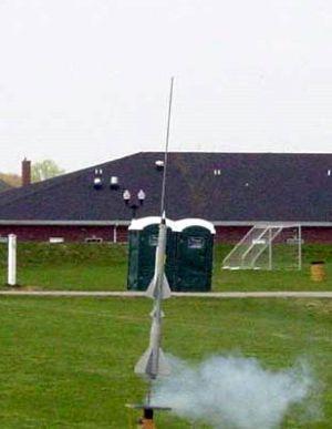 After building the rocket, I built it in RockSim to find the CP. I marked the CP and tested the CG. After finding that they were too close for my liking, I added more nose weight. The list of recommended motors is not the biggest but not short either. I had a G64-7 reload already on hand so I decided to use that. It turns out that I should have used either a smaller reload or added more weight to the nose. The rocket went up straight for 100 to 150 feet, made a 90 degree turn, and started a horizontal loop. After one complete loop, it turned towards the ground and buried itself. After talking with several other rocketeers onsite, it looks like it got it's initial stability from the rod, lost it after the first 100 to 150 feet, and then gained it again as the motor burned out. The rocket was totally destroyed.