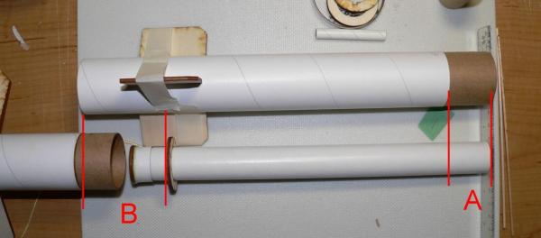 The next warning/tip was determined at the installation of the motor mount into the body tube. Here the instructions ask that you install the above pictured motor mount into the tube with only the one centering ring. The instructions warn you to "make sure that the engine mount assembly is aligned coaxially with the airframe tube." This was too much of a concern for me, so I made three tabs from scotch tape (PML style) on lower centering ring (the one not glued in place yet) and slide it in place to ensure the tube was centered. The tape tabs allow you to easily pull the unglued centering ring back out of the tube.