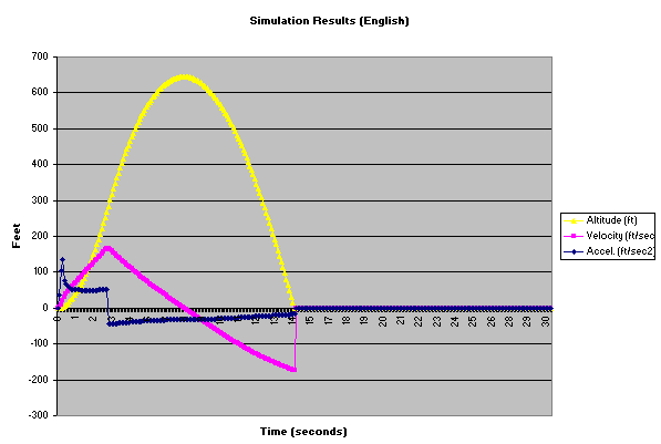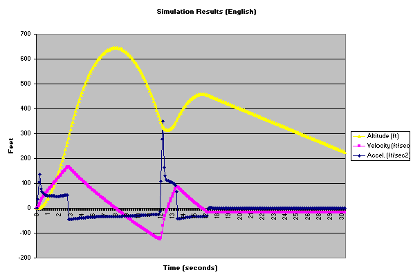 If all went as outlined, the flight log would look like the below graph from H.H. Simit. You can see a flight to about 650 feet, then falling to about 300 feet, ignition of the reverse motor which would bring the rocket back to about 450 feet and then ejection and parachute recovery.