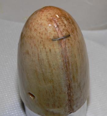 As mentioned, the nose cone will blow off, so there needs to be a tether to keep it attached to the rocket during recovery. This is done by attaching a small piece of piano wire into the outside surface of the nose cone. This spans the groove in the nose cone (see picture above right). I don't know about this, but it is done.