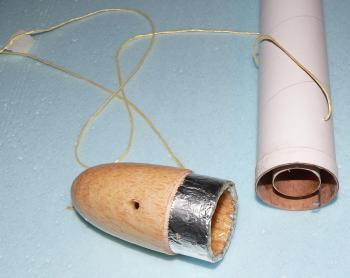 The nose cone is next. It is already hollowed out and has two holes drilled in the sides for use with the "green fuse". The nose cone needs to be protected since it takes the thrust from the TailWind motor. To do this the inside of the nose cone is coated with high-temperature epoxy and the shoulder is protected with a piece of aluminum foil that is glued into place.