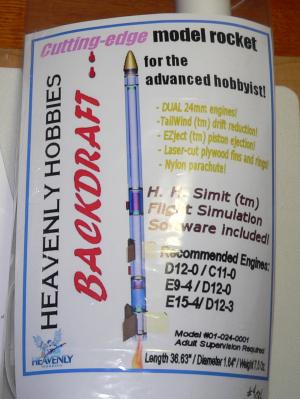I purchased the Heavenly Hobbies Backdraft because it sounded really different. The site says "The exciting Heavenly Hobbies’ BACKDRAFT is a dual-engine rocket...". Notice is said dual-engine, not cluster. It then went on to describe the rocket this way: "The BACKDRAFT looks like a 2-stage vehicle, with booster and sustainer sections. The propulsion module (booster) holds the primary 24mm engine. The sustainer holds a secondary 24mm engine. But the BACKDRAFT is not a 2-stage rocket.