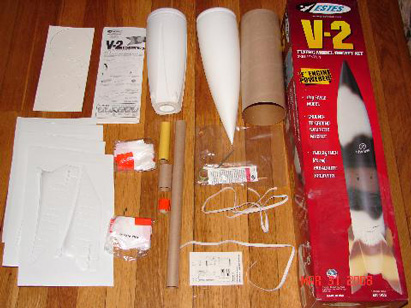 estes_V2partsThe fin construction was challenging but I followed the instructions and things went smoothly. Once I had all fins glued together I just took my time sanding, filling and each one came out great. Gluing the four completed fins to the boat tail was a snap.