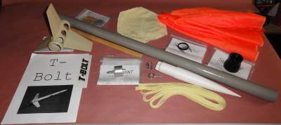 The Giant Leap Rocketry T-Bolt is a member of their "Almost Ready To Fly" rocket kits.  It is a single deployment, 38mm minimum diameter rocket kit that comes with all of the necessary parts.  The only option at ordering is a 38-to-29mm adapter for 29mm motors.