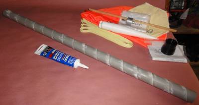 After doing initial RockSim calculations on the rocket, some L3 friends thought the descent rate was too slow with the provided 36" chute and recommended a smaller one.  They liked the 30" numbers better, so I replaced the chute.  Even with the somewhat smaller chute it is a tight fit getting it rolled-up and then wrapped in the kevlar protector to fit in the 38mm tube.  I applied baby powder to help it slide in (and hopefully out).