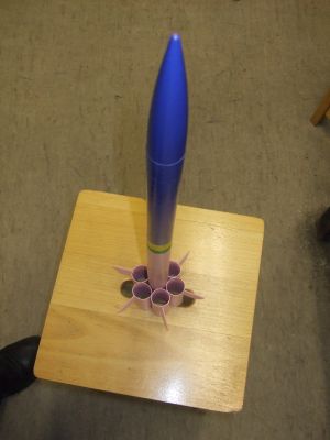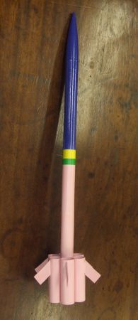 For the review, I repainted the rocket with a more boring pink/blue color scheme. This was partly to cover up some damage to the top of the body tube and where fins had been knocked off.