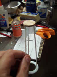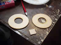 The first real "construction" thing to do is to fish out the two plywood centering rings and a 3/4" square of plywood. The plywood was epoxied onto one of the rings in order to strengthen it for the mounting of an eye bolt for the recovery harness. I used 15 minute epoxy here because I grabbed the wrong bottles.