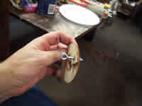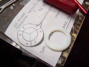 The resin disk has a bevel to it so it must be oriented correctly. I made sure the beveled side was up and then cut out the the template. I taped the template onto the upper surface of the disk and scrounged around until I found a 3/32" drill bit. Six holes were then drilled in the places indicated on the template.