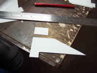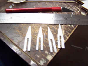 The Redstone had another little detail between the fins and the rudders. This kit builds that "thingamabob" out of styrene as well. The template must be cut from the plan that is provided. It is then laid on the styrene to trace the outline four times. I scored the styrene with a razor knife and steel rule. I found this much more difficult that cutting the fins themselves.