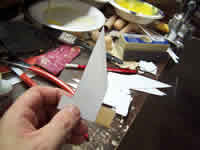 A fact that may be worrisome, for somebody who does not READ the instructions, is that the styrene fins are somewhat larger than the plywood cores. There is a good reason for this. The plywood core is set flush against the base and root edge of the styrene. The styrene is then lightly scored with the razor along the leading edge. The rudders on the outer edge are also scored and then snapped off and saved for later.