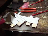 At this point, the plywood cores were sandwiched between styrene sheets and bonded with CA. The bevels on the leading edges of the fins still had to be dealt with though. This was easily done with the application of a solvent type of plastic cement. I used Plastruct. This welded the leading edges together and healed all gaps.