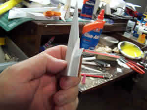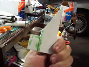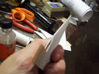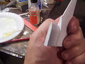 The styrene along the angled leading edge of the fins was scored but not snapped off. The scoring was to facilitate bending an angle into the leading edge. After trying several methods of getting this right, the one that worked best for me was to put the plywood core into place and then gently bend the plastic towards the centerline of the fin.