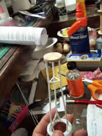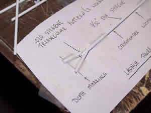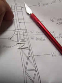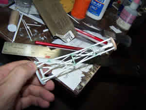 The vertical struts were fabricate one at a time. A piece of the styrene cut to length was taped down on top of the template. Two further pieces of the 3/16 tubing were cut to the length of the "Y" at the bottom of the structure. These were then shaved on one end to achieve the desired angle. When they fit well enough, they too were taped into place on the template and the three pieces were joint with Plastruct solvent cement.