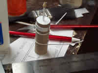 The upper disk of the LES tower is made of plywood. I cut out its template, taped it into place and drilled the three holes it calls for. The disk was then slid into place at the upper end of the assembly. Since things seemed to fit, both ends were secured with CA.