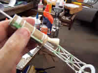 The horizontal members of the LES trusses are made from 1/16" styrene tubing. Using the plan as a guide for length, I cut the three upper horizontals. I placed them singly at the marks made earlier doing one side at a time and using Plastruct solvent weld. I let on side dry and then brushed the other side with a generous amount and squeezed it into place between the uprights. Since there was a bit of bowing, I used cellophane tape to hold the structure tight as it dried.
