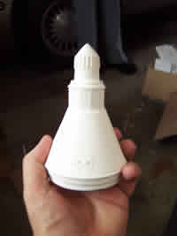 Finally, I learned that another member of my NAR section had the right motor and no use for it. About the same time, I started building a LOC Cyclotron which did come with a chute of the correct size and with much thinner shrouds. I switched the chutes, got ready to fly and tragedy struck. I dropped the capsule on a concrete floor and sheared the tower.