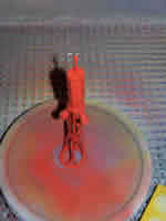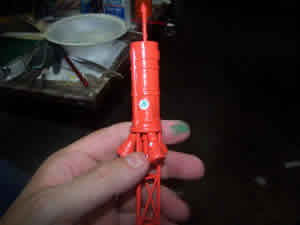 The LES tower was primed with 2 coats of Testor's gray primer. That made an immediate difference in the appearance as it made everything uniform and not the sick mixture of green, white and wood product. The instructions on the can said that I had to paint within 2 hours or wait 2 days. Looking the LES over, I did not see where sanding would be an issue so I gave the entire structure 2 coats of Testor's Competition Orange. It was actually starting to look like something good was going to come of this endeavor.