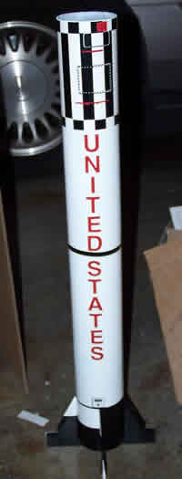 The primer got two days to dry and then it was lightly sanded. The body of the rocket was then painted with two coats of Testor's gloss white. The capsule was likewise sanded and then treated to two coats of Testor's gloss black.