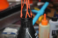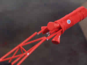 The LES tower being dry by this point, was inverted and set on its cap. The Triple Mini assembly was then glued to the center of the base with CA making sure that the mini nozzles were rotated in such a way as to be centered on the LES truss panels.