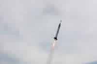 Finally my turn came and at the end of the countdown the launch button was pushed. For a while, I thought I had misfire but I noticed something was happening in the motor. Then it roared to life with a lovely red flame and started to move. It looked good coming off the pad but not too far up it angled into the wind and kept climbing. When ejection occurred, I could not tell that the chain stitching made any difference at all but I did have a successful chute deployment. I could also tell right away that the monofilament line used to try to keep the capsule horizontal had not been up to the task. The entire rig spun around on its way down, drifting much more than I expected along the way.