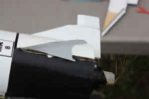 All four of the fins were mounted using 5 minute epoxy. A small batch was made for one fin and then a toothpick was used to trowel it into place along the BT. It was also used to force epoxy into the rivet holes. After that, it was a simple matter to press the fin into place, check for alignment and hold it in place until the epoxy set up stiff enough to hold on its own. The process was repeated for the other three fins.