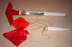 The Firehawk comes with an unassembled 18 inch plastic parachute from Hartle Engineering. The instruction manual includes the steps for assembling the parachute, which is fairly standard. Tape reinforcement disks are applied to the corners of the chute, and there are enough disks for both sides (a nice detail). The shroud line is cut into three equal lengths and then tied through the disks at each corner of the chute. The instructions direct you to pass the shroud lines through the screw eye in the nose cone and then thread the chute back through the loop. You are then directed to pull the shroud lines tight and set the knot around the screw eye with a drop of glue. This is the only step in the instructions that I would actually advise someone NOT to do. First off, attaching the parachute directly to the nose cone will eventually result in tangled shroud lines, and so I always attach my chutes to a fishing type swivel and then to the rocket. My real concern, however, is that by gluing the shroud lines to the nose cone, you are left with no way to untangle the chute when it does get snarled up. This is probably the only item that could be improved in this kit. I also attached a 6x6 inch Nomex® heat shield to the Kevlar® shock cord to eliminate the need for wadding. Since the first flight of my Firehawk happened on a very windy day, I actually used a 15 inch Top Flight nylon chute, and since the rocket recovered without any problems I have stuck with this setup ever since.