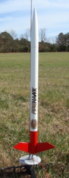 Finishing the Firehawk is fairly easy as well. I used Elmer’s wood filler to add smooth fillets to the fin and launch lug joints. The nose cone and fins were sealed with two coats of thinned down wood filler and sanded smooth. My standard finishing routine is 2 coats of primer (Rust-Oleum Painter’s Touch Sandable Primer) and then 2 coats of Krylon spray enamel, working down to 400 grit sandpaper between coats. The nose cone and forward 18 inches of the body are painted gloss white, and the aft 5 inches of the body along with the fins are painted gloss red. The decals included with the Firehawk were excellent, great colors and very clean. The instructions do not advise any type of coating before applying. The individual decals are fairly large, and so a little care must be taken when handling and positioning them to avoid any folding or tearing. Overall the decals were easy to work with and set up very nicely. The instructions do recommend clear coating the finished rocket to protect the decals, and I used Testors Gloss-Coat. After everything had dried I noticed that there was some very faint color bleeding near the decals, but I couldn’t tell if it was from the red paint or the decals. I had never observed this result before with this combination of finishes, so I chalked it up to the conditions at the time. The end result is a nice looking rocket with unique lines, simple paint scheme, and eye catching decals.
