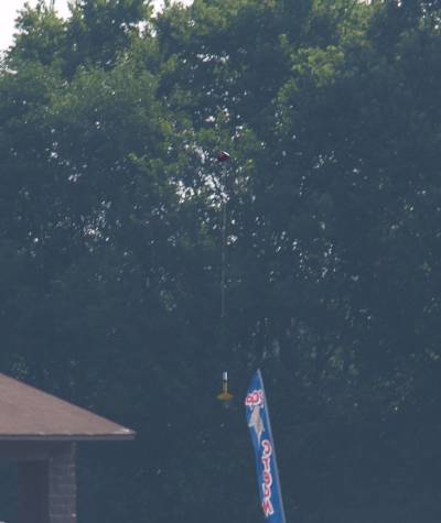 The next flight was on a C11-7 in the dead air of NARAM 53. I had planned to go with the D12 for this flight, but I'd used the last one in my motor box on an earlier flight. The flight was again high and straight, but ejection came a bit late. As a result, the nose cone rebounded into the top of the body tube and received a gash for its troubles. Shoule be an easy fix. D12-5 the next time. I SWEAR IT!