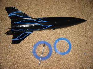 Finishing was pretty typical for most Estes rockets. I used wood filler for most of the imperfections like the tube spirals. For priming I used Kilz spray primer. That is hands down the best primer I have ever used and I followed that up with a couple of coats of gloss black. Then I picked up some 1/8" plastic blue masking tape for the flames at a specialty painters store and used 1 inch blue masking tape for all of the areas that stayed black. A couple of coats of red, yellow, and white, and my flames were complete.