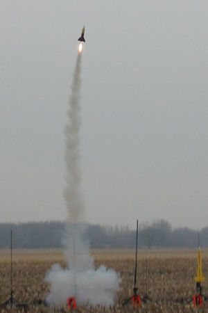 So far, I have flown this bird twice. First was at Michigan Team 1 Fall 2006 launch on an F20 with a 7 second delay. RockSim predicted an optimal delay of just under 7 seconds but that was far too long. Then on January 27th, 2007, I went to Tripoli Michiana launch and flew it on an F52 with a 8 second delay. Again, RockSim predicted a touch over 8 seconds for the optimal delay. Real world results differ because again the delay was again too long. Despite the longish delays, both flights were a success with no damage. I believe this is ready for a G64!