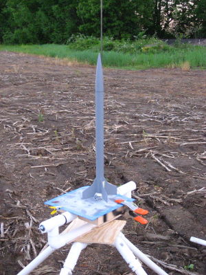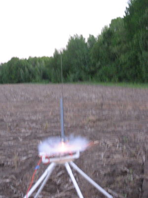 Mattie was put in the car so the second attempt went without a hitch. My system uses a 12-volt lawn tractor battery so there is little, if any, delay. The engine hissed for a millisecond, there was a burst of smoke, a medium-fast lift-off, and then a straight, beautiful launch. I'm 40 and can't help but get a rush out of this. I'd guess it reached 1000 feet or more (primer wasn't even sanded smooth yet so it probably didn't go the full 1200.