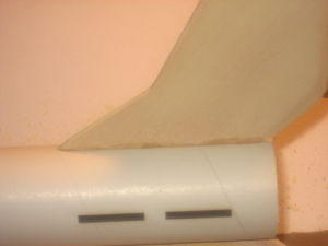 Another mistake involved sealing the fins prior to attaching them (a diversion from the instructions), figuring it would be easier to seal and sand with them off. I used paper skins on all my previous kits, making sealing unnecessary. As mentioned above, I over-sanded one fin and it was too narrow, making a loose fit.