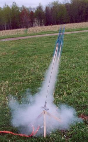 At launch only 3 of the 4 engines lit, causing there not to be enough "oomph" for a decent flight. touched ground just as two of the noses popped, with a third being launched about 20 feet away (no, it did not have 20 feet of shock cord).