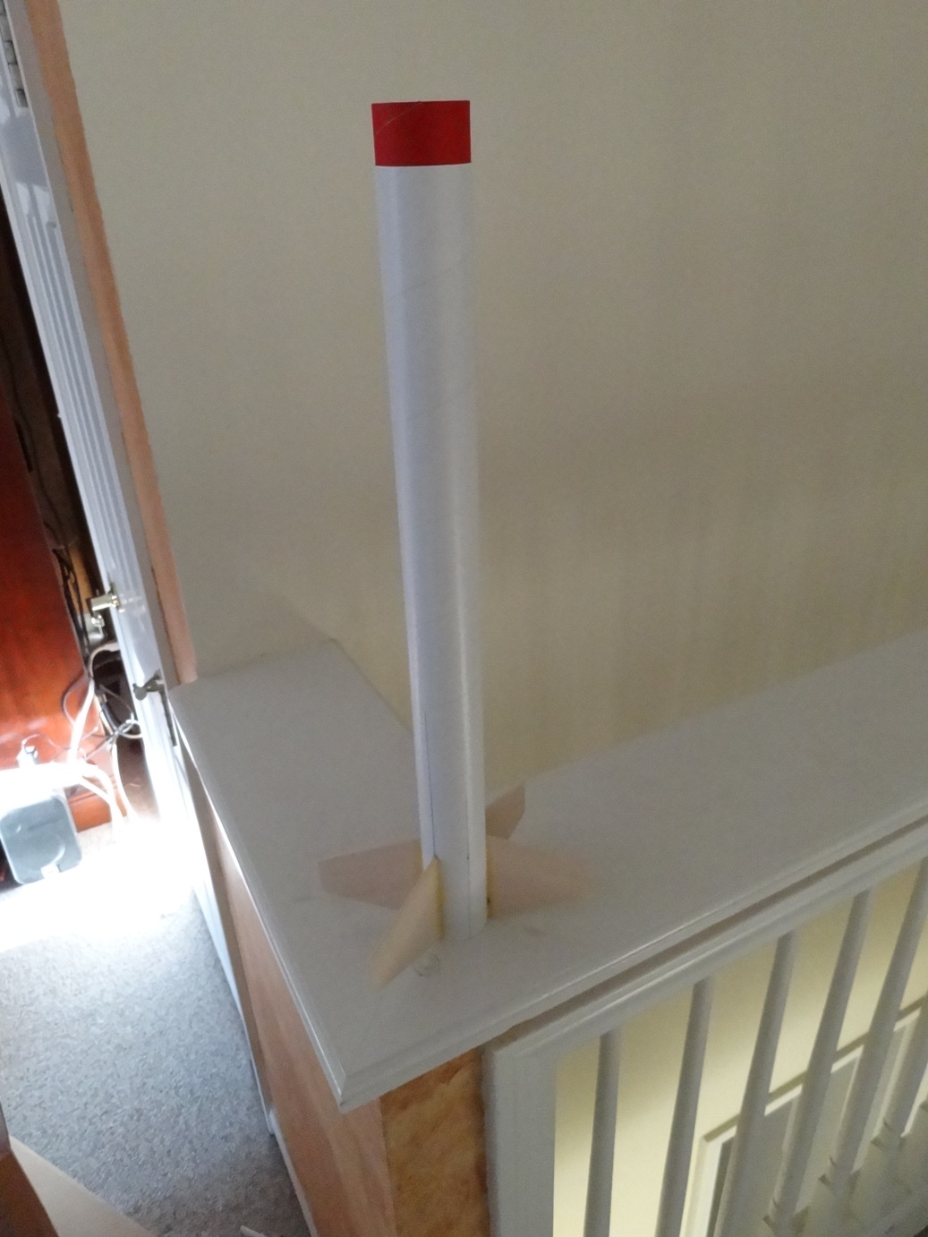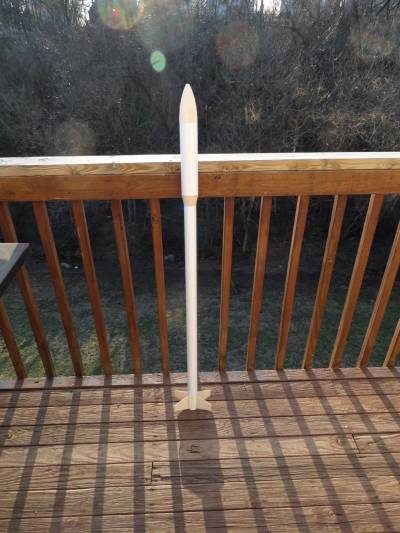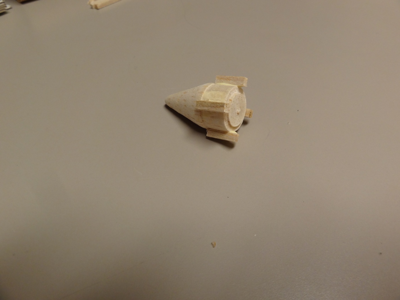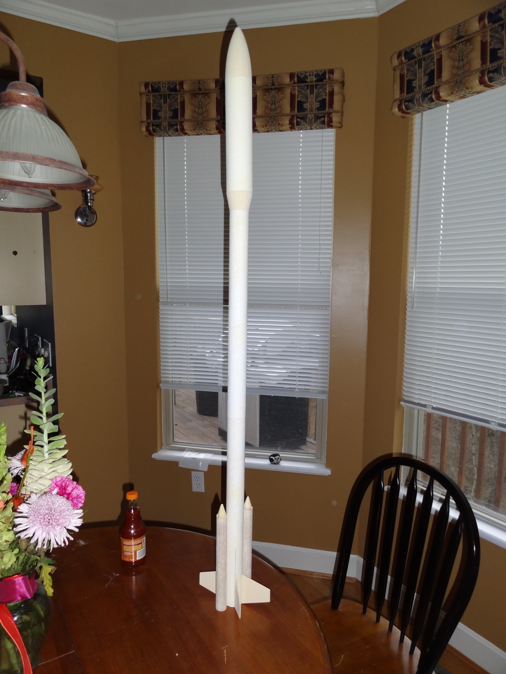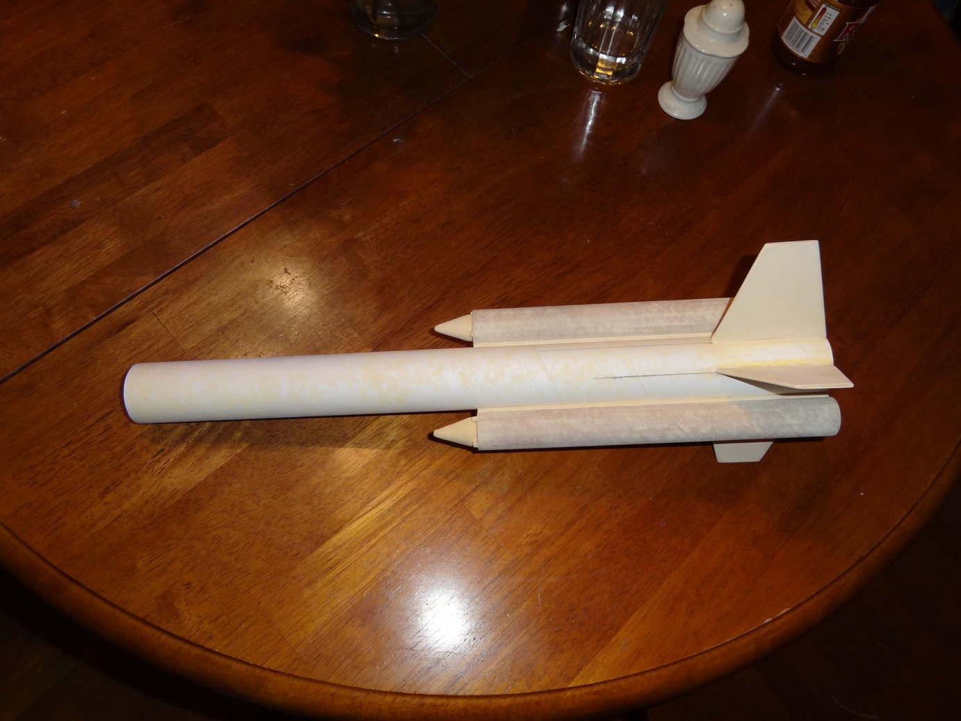 This isn't an FSI project, but more of an Estes take at the Intrepid since the parts I used were all to Estes tolerances.  I didn't want to build an exact clone, but more of a suggestion of the Intrepid, so I went with what I was most familiar with.  This is a big bird, and as such, I built it in sections.  The lower fin can came together first, and the oddly spaced fins were the first problem that I tackled.  The Intrepid is for the most part a six fin rocket with two fins missing where the outer pods are attached.  To this end, I printed off a template for a 6 fin BT-60 bird and marked the lines appropriately with four fins and two pods.  The fins were glued in place first, then I turned my attention to construction of the two side pods.  The vented nose cones had to be constructed using four small balsa strips and a BNC-???? nose cone.  The balsa strips were evenly spaced around the shoulder of the nose cone to provide an escape for the exhaust gases, then sanded evenly so that they slid into the top of the BT-50 pod tube.  Engine blocks were then glued into the pods at the correct depth for Estes D motors.  The pods were mounted to two balsa strips cut to the same length as the pod tubes, and the pods were then glued into the spot where the fifth and sixth fins would normally have gone.  I tied a 36" length of Kevlar around the motor tube behind the front centering ring as a shock cord mount, and attached it to a 36" length of 1/4" sewing elastic.  I clearly have issues when it comes to shock cord length.  A medium screw eye was glued into the bottom of the transition, and the payload section was glued together to keep the inevitable loss of the nose cone from happening.