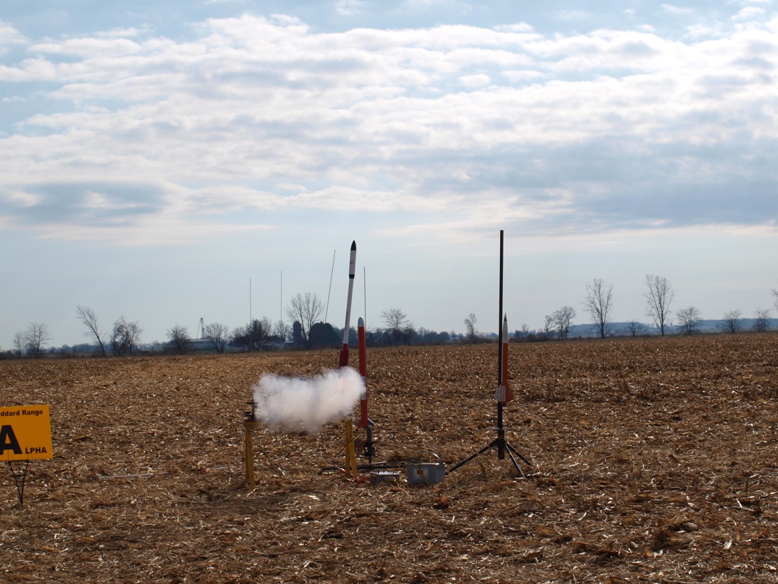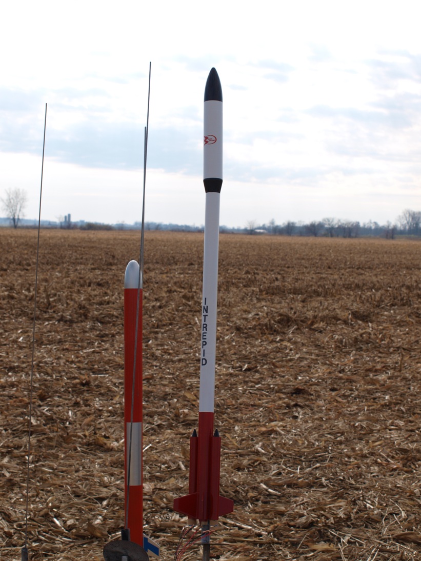 First flight came on a windy, raw day at the TORC field in South Charleston, Ohio.  I had the D11-P motors with me, but at the time I had yet to acquire a clip whip, so I just flew it as a single stager.  Performance was as expected, with the slow burn of the E9 making for a long, high flight.  Also as expected was the windcocking, which took the rocket downrange to the east at a steep angle.  Ejection occurred as the rocket was almost horizontal, but slowing enough that it was fairly gentle.  I'd used a smaller parachute to cut down on the drift and this worked well as the Intrepid recovered about 200' out in the cornfield, but directly in front of the pads.