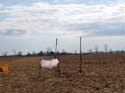 I had planned to fly it as a cluster at a Tri-City Skybusters launch in the spring with my brother in law, but I ran out of gas before I could work my way to the Intrepid.  It never occurred to me that it would be six months before I got the chance to do the cluster, but that was exactly what happened.  I finally got to fly it in cluster form at the inaugural OAMC (Ohio Aerospace Modeling Consortium, formerly TORC,) launch back at the South Charleston field.  It was another windy day, and the Intrepid was the last flight I made before starting my range duty.  The two D11-Ps were a tight fit in the side pods, and in fact needed some rather forceful suggestion to slide to a workable depth.  (No masking tape for these motors, and I'm not really sure they'll come out without damaging the rocket.)  Another E9-4 filled the main engine mount, but I gave serious thought to an E9-6 because of the extra thrust from the D11s.  I angled the rod slightly into the wind, then attached the clip whip to the igniters, making sure to curl the leads to give maximum space for the clips to touch.  When I was satisfied I returned to the LCO table and manned my camera, making sure that it was in burst mode.  I was hoping to catch the Intrepid both igniting and leaving the rod, but once it got moving, it moved QUICK.  I got ignition and the slightest trace of motion up the rod, but just smoke after that.  It was hauling!  The rocket windcocked somewhat, but nowhere near what I had expected.  Ejection occurred slightly early, which may have had a hand in what happened next.  As the Intrepid floated back over the flightline toward the cornfield behind us, something detached from the rocket.  I couldn't tell what it was, but the fact that it looked to be mostly white made me think payload section, which was correct.  The payload section landed hard behind the parking area, cone first, which caused quite a gash in the balsa.  After retrieving the payload section, I started out toward the spot where the rest of the rocket had landed, only to find it being returned by another hospitable flyer.  Good thing.  My feet were killing me.