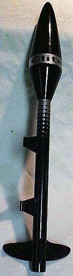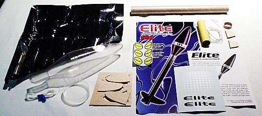 Rocket PicNow this is an egg lofter! Custom has trimmed the weight and size of its new Elite down to the bare essentials required to get an egg as high into the air as possible. The light-weight payload section with its power series nose cone (often mistakenly called "parabolic") is its most prominent feature and is reminiscent of the old Nova Egg Cone once found on Apogee's Hydra. The minimum diameter body tube and hard balsa fins further cut weight, and the sparing water slide decals keep surface finish smooth while adding just the right touch of class. The Elite could be painted just about any decent color (red springs to mind as a good choice), but the suggested basic gloss black touted on the bag art makes for a serious-looking bird. Performance is terrific for a kit egg lofter; on a C6 engine, the Elite shames my Estes Omloid by over 100 feet! Her pre-cut 18" diameter mylar 'chute makes for some good duration, too.