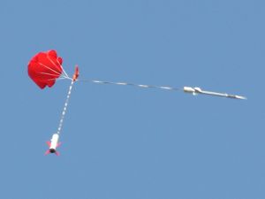 The chute provided is a 28" red ripstop nylon chute. It's top-of-the-line, bright, visible color, very sturdy, and circle-shaped with 8 shroud lines. It's a bit overkill as descent is very slow, on the order of 12 to 15 fps, and a 24" chute would be better for smaller fields and windy days.
