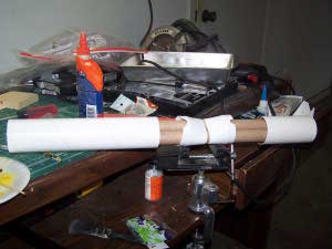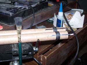 Another item that still needed to be addressed was the installation of the launch lugs. There are two of them. One is located on the lower BT and the other on the upper. A line had been marked earlier and I glued them on with the aid of a rod to keep them aligned. That left me ready for finishing.