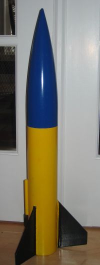 No special techniques are required to finish. Just prime and paint. I painted mine with Rustoleum primer and then a yellow body, blue nose cone, and black fins.