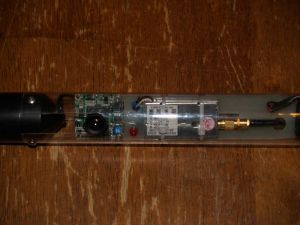 The transmitter I used is a commercial unit, Model AVX900T4, sold by SuperCircuits, Inc., a large supplier of CCTV and surveillance video equipment. It is designed for operation from 12VDC power and produces an RF carrier output of 500mW. It accepts standard NTSC video and baseband audio inputs and provides RF output via an SMA connector. This is a very small device (1" x 2" x 3/8") or approximately the size of a typical rocketry altimeter such as the MAWD. Transmitter weight is approximately ¾ ounce. Use of this unit requires a Technician class or higher amateur radio license in the USA. The manufacturer claims a 1 mile range under optimal conditions.