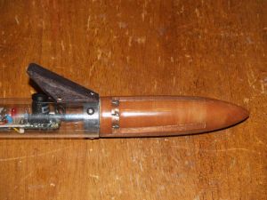 The transmitter module was provided with a small flexible whip antenna, which I originally planned to mount inside the hollow plastic nose cone of the rocket. Testing soon revealed that the black plastic nose cone actually acted as an RF shield, reducing transmitted signal strength substantially. I can only guess that the black pigment in the plastic is carbon black or some similar conductive material. After toying with the idea of mounting the antenna externally on the tip of the nosecone (which looked really cool but would most likely been damaged on landing), I opted to fashion my own nosecone from polystyrene foam and incorporate a pair of copper tape dipole antennas into the outer surface of the cone. The cone was made in a non-specific ogive shape (sanded to shape in a lathe) then coated with a mixture of West System epoxy and phenolic microspheres for strength. After curing, the epoxy surface was sanded again and the copper foil tape patterns applied. A length of RG-174 miniature coaxial cable was used as a feedline for the antenna and brought out at the base of the nosecone. After testing and tuning the antenna for minimum VSWR, the copper foil tape was overcoated with 2 layers of epoxy for weather resistance. A male SMA connector was installed on the transmitter end of the feedline.