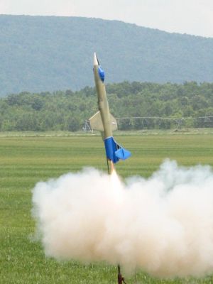 I opted for a military scheme. For the canopy glass I masked off the frame structures, cleared the tape to reduce leaking, then I sprayed a Duplicolor chrome. Once that dried a bit, I sprayed iridescent blue with the airbrush. It's hard to tell from the pic, but it has a sort of glass-like sheen from a distance. (That's the idea anyway.) The Excelsior decal worked very well by following the included tips. They have a "painted on" quality. I put my NAR# on the tail.